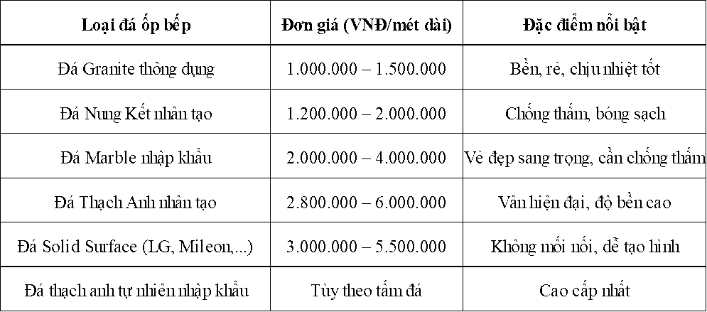 Ghi chú: Báo giá đá ốp bếp tại Bà Rịa Vũng Tàu có thể thay đổi theo mẫu mã, thương hiệu và yêu cầu thi công.